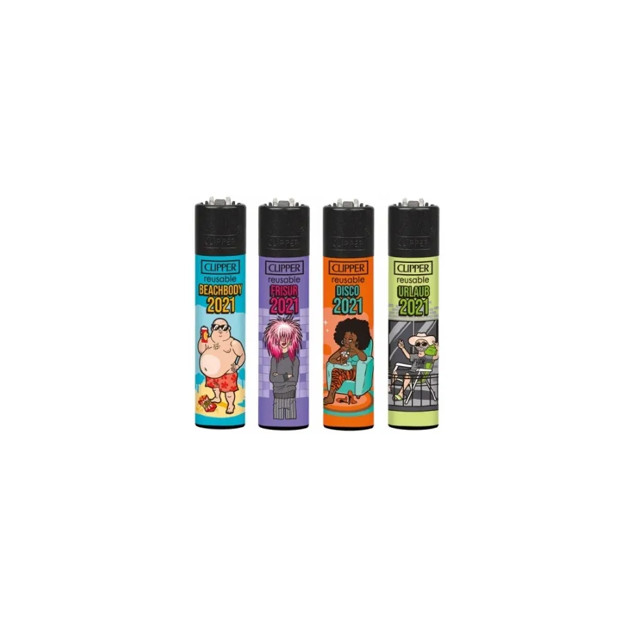 Komplet 4 zapalniczek Clipper z grafikami Lockdown Mood. Kultowe, wielokrotnego napełniania i z wymiennym krzemieniem — trwałe w codziennym użyciu i świetne do kolekcji.