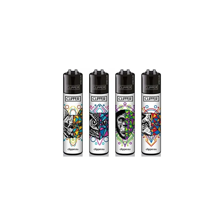 Clipper Geometrical Animals to komplet 4 zapalniczek wielokrotnego napełniania z geometrycznymi motywami zwierząt. Klasyczny Clipper oferuje praktyczny płomień, który powiększa się po przechyleniu — ułatwia podpalanie bong i fajek.