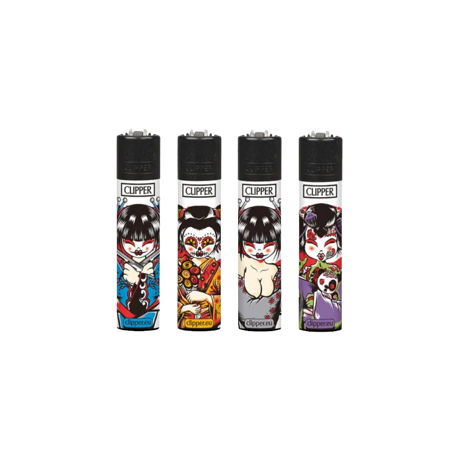 Clipper Geishas 2 to komplet 4 zapalniczek wielokrotnego napełniania z grafikami inspirowanymi motywem gejsz. Klasyczne Clippery oferują praktyczny płomień, który powiększa się po przechyleniu — wygodne przy bongach i fajkach.