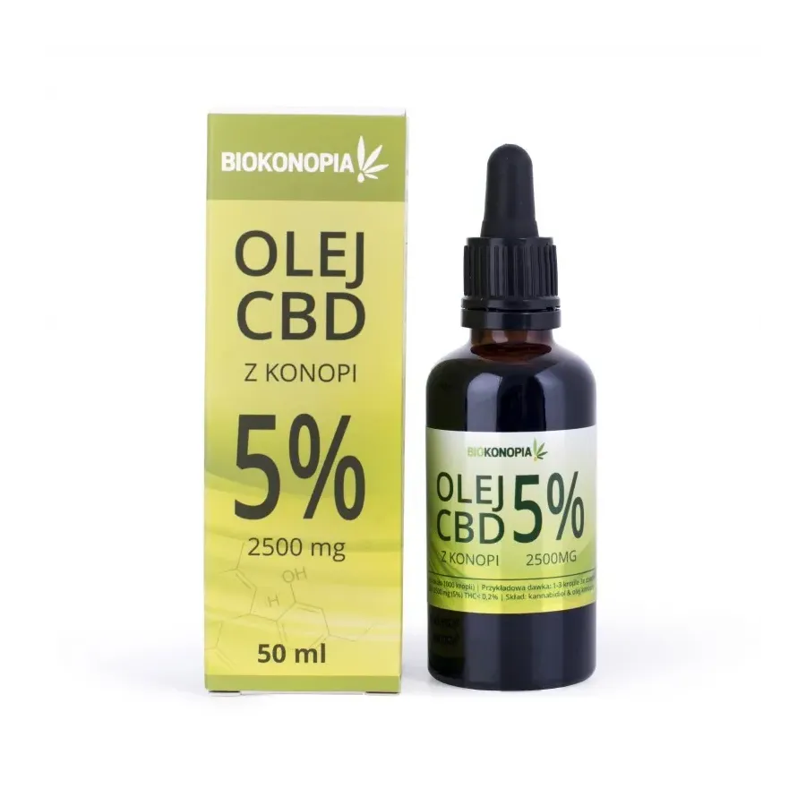 Olejek konopny 5% CBD 50 ml (2500 mg) — około 1000 kropli z certyfikowanych kwiatostanów