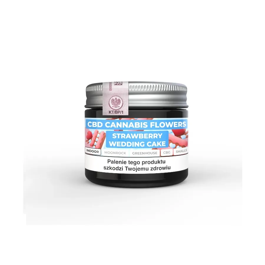 Wysokiej jakości susz CBD w odmianie Strawberry Wedding Cake – 2 g starannie przygotowanych kwiatów konopi włóknistych, o zawartości THC poniżej 0,3 % i naturalnym profilu CBD (~4-6%). Produkt pochodzi z certyfikowanych upraw i oferuje intensywny, słodko-owocowy aromat truskawek połączonych z nutą ciasta — idealny wybór dla użytkowników poszukujących aromatycznych doświadczeń w legalnej formie.