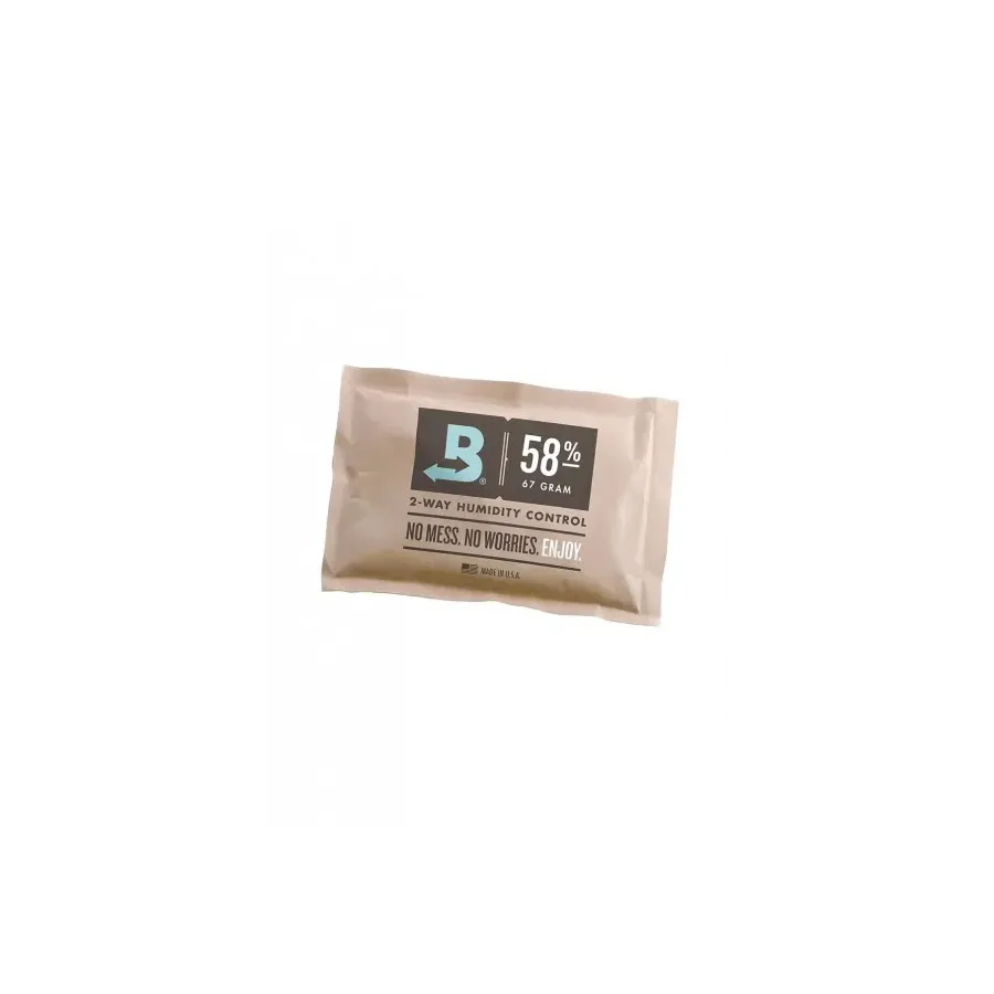 Saszetka Boveda 58% (67 g) zapewnia precyzyjną kontrolę wilgotności w pojemnikach z suszem, kwiatami lub ziołami. Dzięki technologii dwukierunkowej automatycznie pochłania lub uwalnia wilgoć, utrzymując stabilny poziom około 58% RH – co pomaga chronić aromat, smak i strukturę materiału. Pojemność 67 g wystarcza na około 454 g suszu.